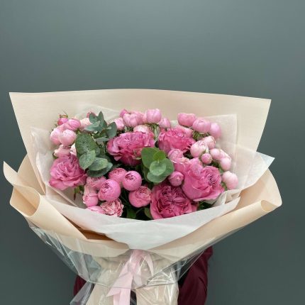Букет из французской розы, эустомы, маттиолы и кустовой пионовидной розы Джульетта с эвкалиптом