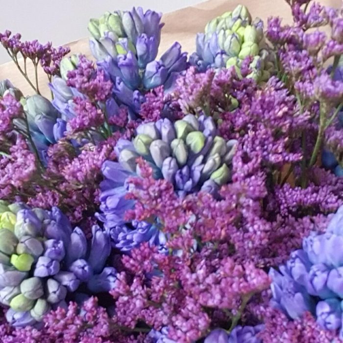 Гиацинт – 11 шт.Лимониум – 5 шт.Упаковка крафт – 2 шт.Лента атласная – 1 шт.