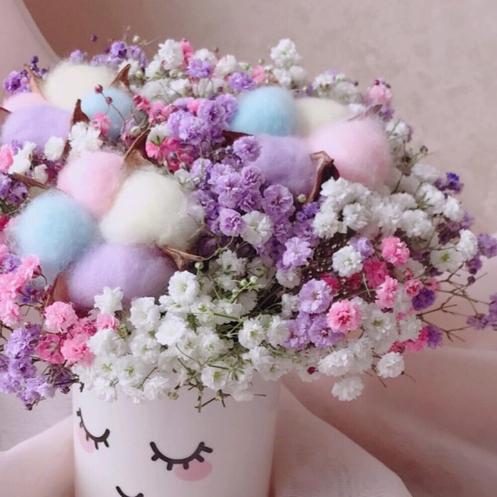 Флористическая губка – 1 шт.Кашпо керамика – 1 шт.Инструкция по уходу – 1 шт.гипсофила радужная – 3 шт.хлопок радужный – 3 шт.