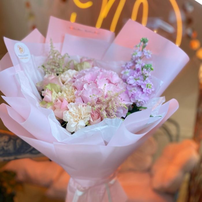 Гортензия розовая – 1 шт. діантус – 3 шт. матіола – 2 шт. троянда рожева – 5 шт. екзотична зелень – 3 шт. оформлення букета в упаковка – 1 шт.