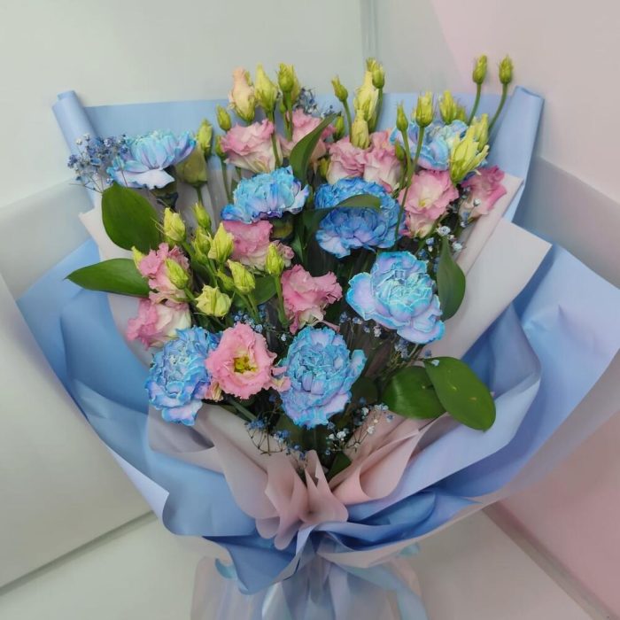 Лизиантус махровый розовый – 4 шт.диантусы голубые – 7 шт.гиасофила – 1 шт.Рускус – 3 шт.Дизайнерская упаковка – 1 шт.