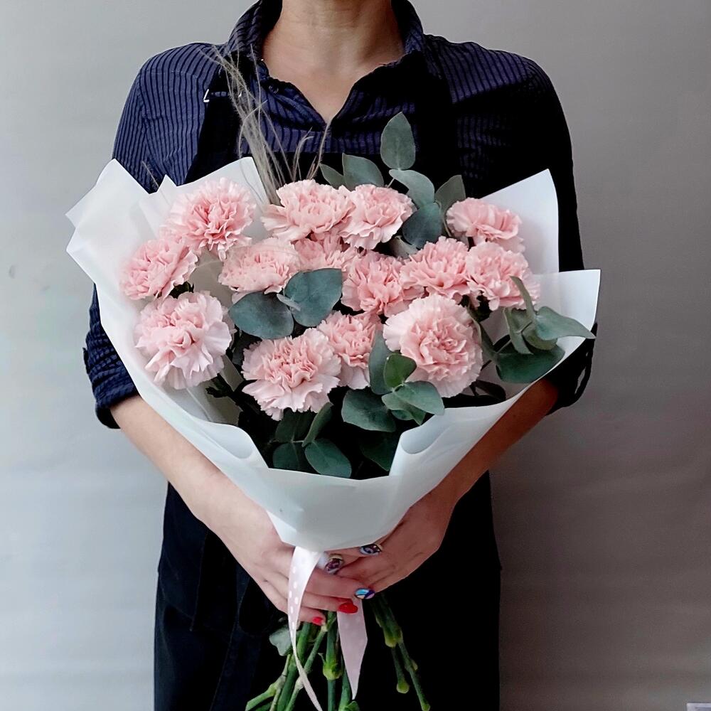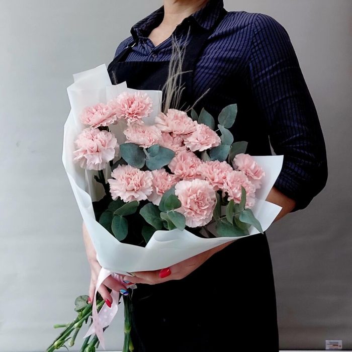 Диантус – 15 шт.Эвкалипт – 2 шт.Ковыль – 1 шт.Упаковка дизайнерская – 3 шт.Лента атласная – 1 шт.