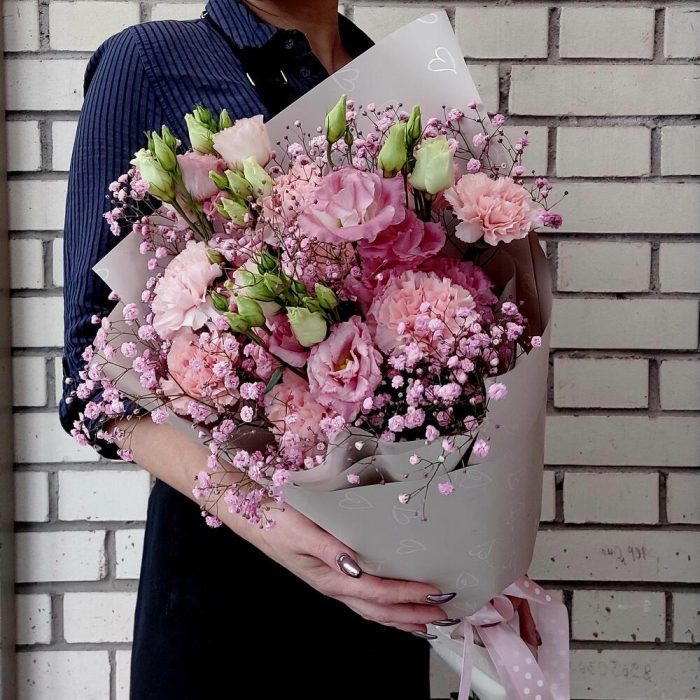 Лизиантус розовый – 3 шт.гипсофила радужная – 2 шт.Диантус – 9 шт.Упаковка дизайнерская – 3 шт.Лента атласная – 1 шт.
