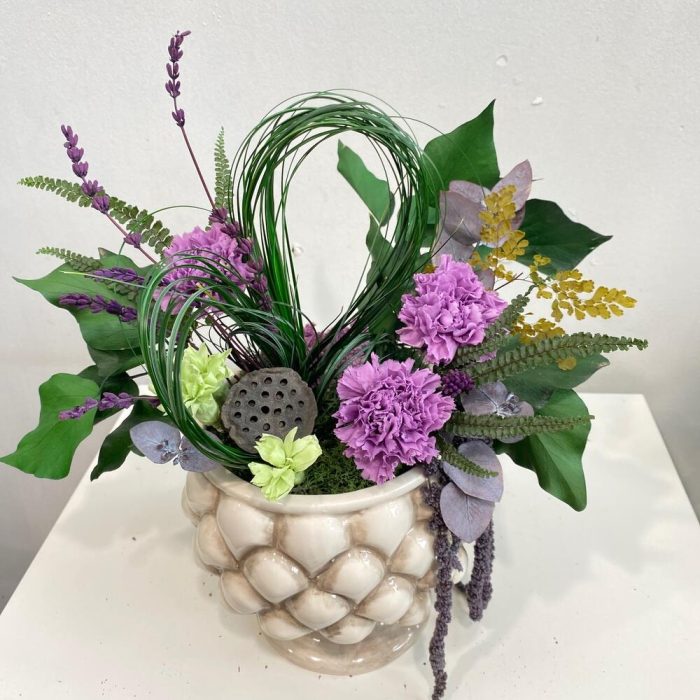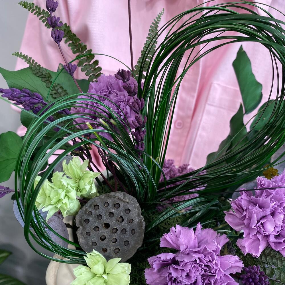 Ваза керамика – 1 шт.Лотос сухой – 1 шт.Эвкалипт стабилизированный – 1 шт.амарант стабилизированный – 1 шт.диантус стабилизированный – 3 шт.мох ягель стабилизированный – 1 шт.лаванда стабилизированная пучок – 1 шт.диантус мини стабилизированный – 3 шт.хедера стабилизированная – 2 шт.берграсс стабилизированный – 3 шт.папоротник фельси стабилизированный – 3 шт.
