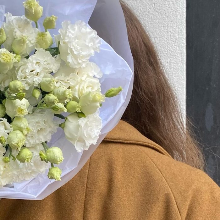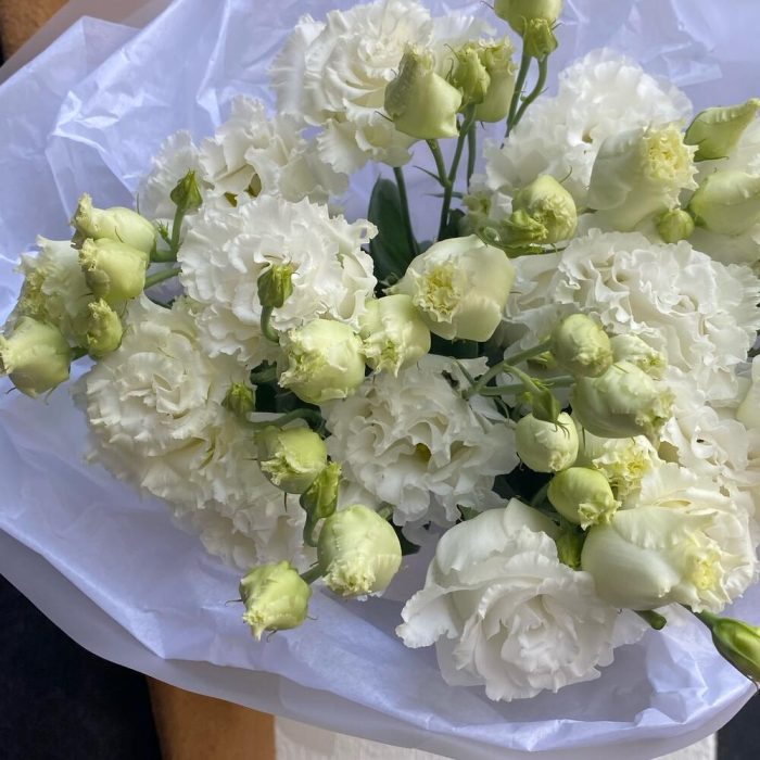 лизиантус махровый белый – 7 шт.Тишью – 2 шт.Упаковка дизайнерская – 4 шт.лента атласная брендированная – 1 шт.