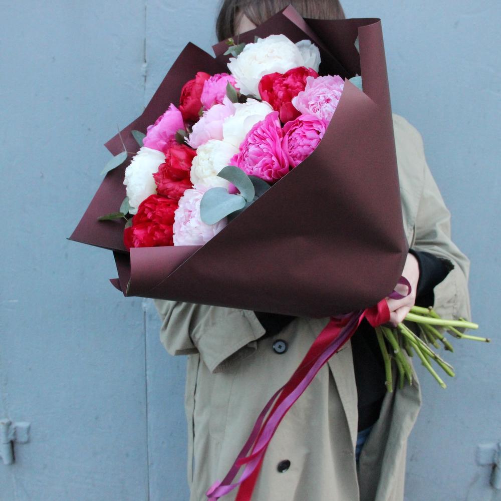 Пион – 15 шт.Эвкалипт – 7 шт.Упаковка – 3 шт.Лента атласная – 2 шт.