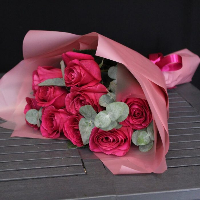 Роза эквадор Pink Floyd – 9 шт.Эвкалипт – 3 шт.Пленка матовая – 4 шт.Лента атласная – 2 шт.