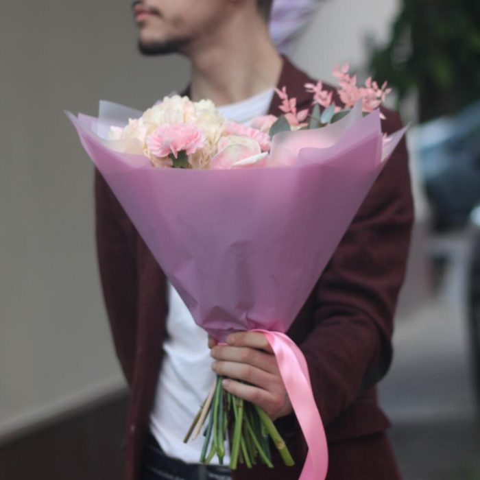 Писташ – 4 шт.Эвкалипт – 2 шт.Лента атласная – 1 шт.Роза пионовидная – 5 шт.Упаковка дизайнерская – 4 шт.Гортензия розовая – 1 шт.Диантус розовый – 5 шт.рускус стабилизированный – 1 шт.