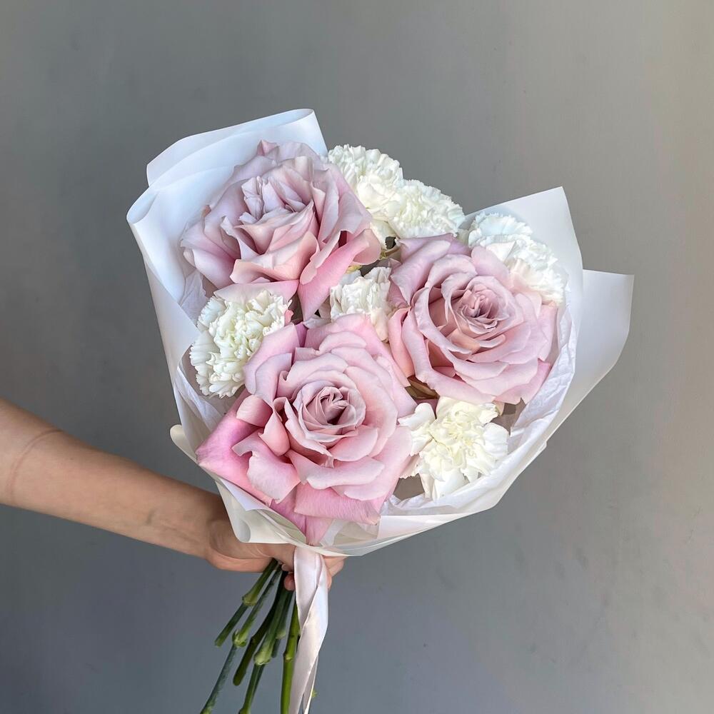 Лента – 1 шт.Гвоздика – 6 шт.Дизайнерская упаковка – 1 шт.роза faith премиум – 3 шт.