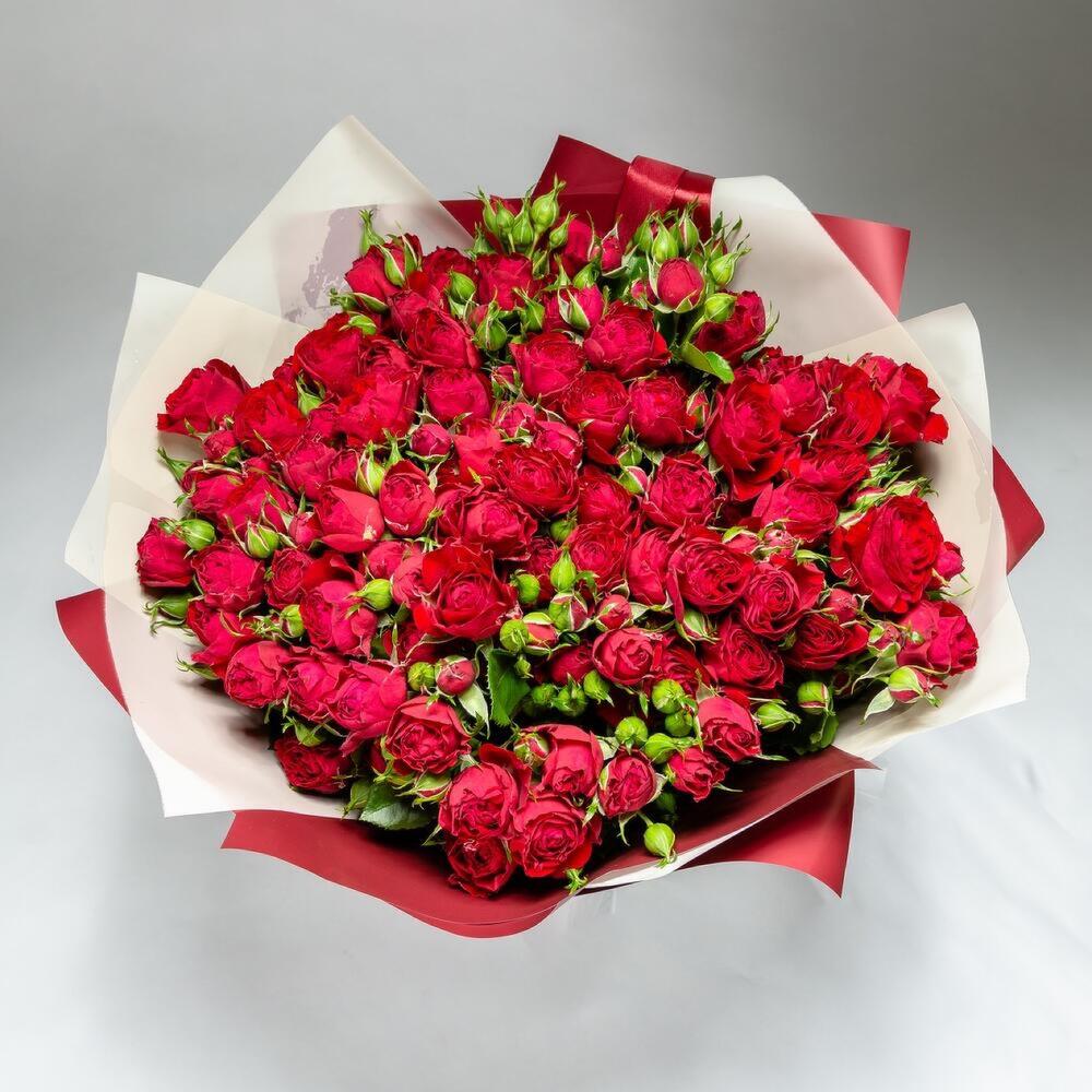 Роза кустовая – 29 шт.Упаковка дизайнерская – 2 шт.Лента атласная – 2 шт.Открыточка с вашими пожеланиями – 1 шт.хорошее настроение – 100 шт.инструкция по уходу за цветами – 1 шт.коробка переноска – 1 шт.Кризал – 1 шт.
