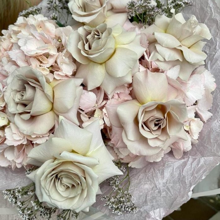 Гортензия – 2 шт.Лимониум – 2 шт.Роза – 7 шт.Упаковка дизайнерская – 4 шт.