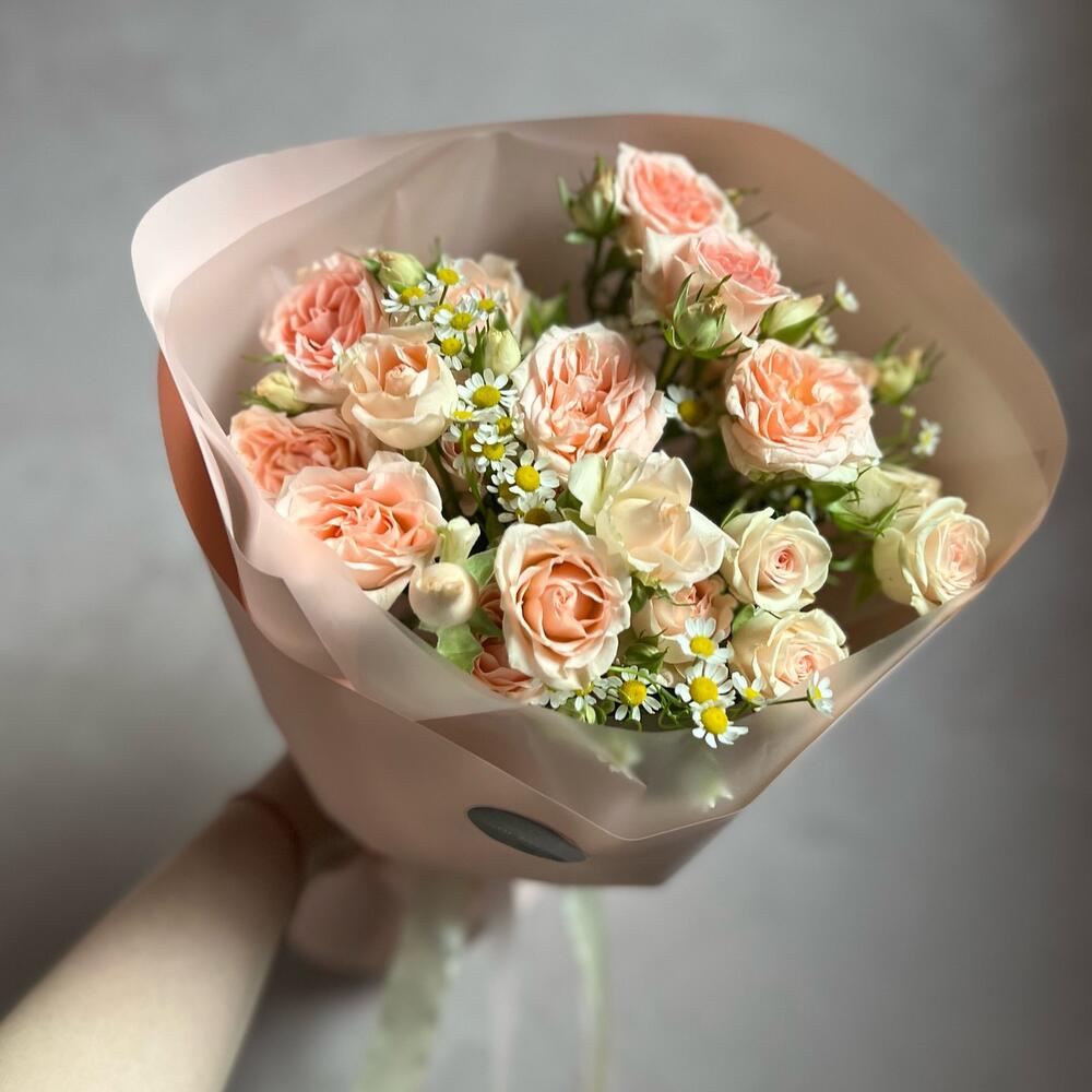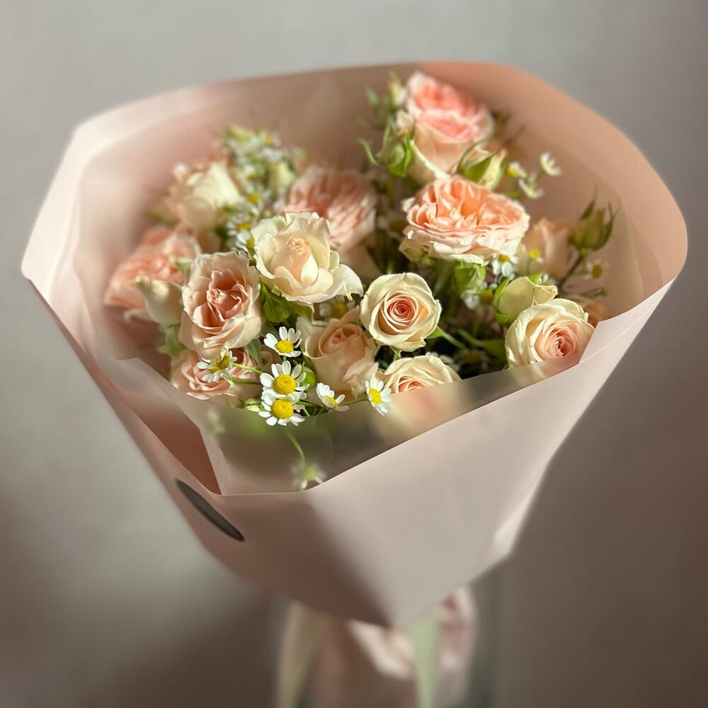 Кустовая роза – 5 шт.Танацетум – 4 шт.декоративная упаковка – 1 шт.Атласная лента – 1 шт.