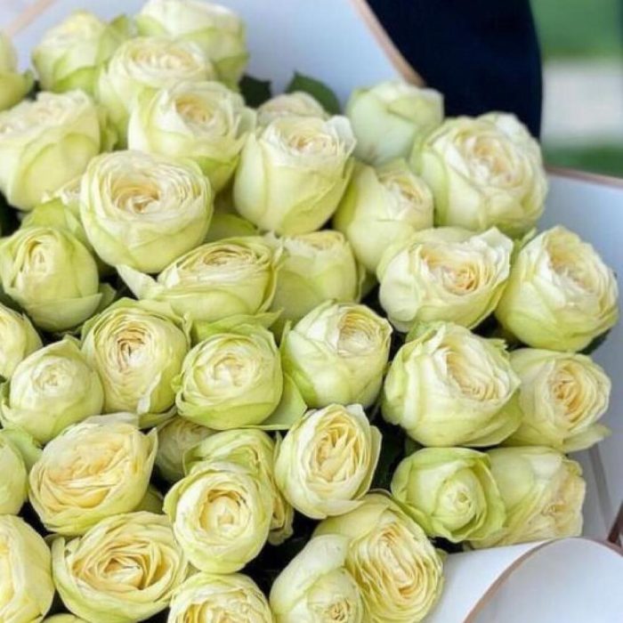 розы пионовидные белые – 65 шт.Упаковка дизайнерская – 2 шт.Лента атласная – 2 шт.Открыточка с вашими пожеланиями – 1 шт.хорошее настроение – 100 шт.инструкция по уходу за цветами – 1 шт.коробка переноска – 1 шт.Кризал – 1 шт.