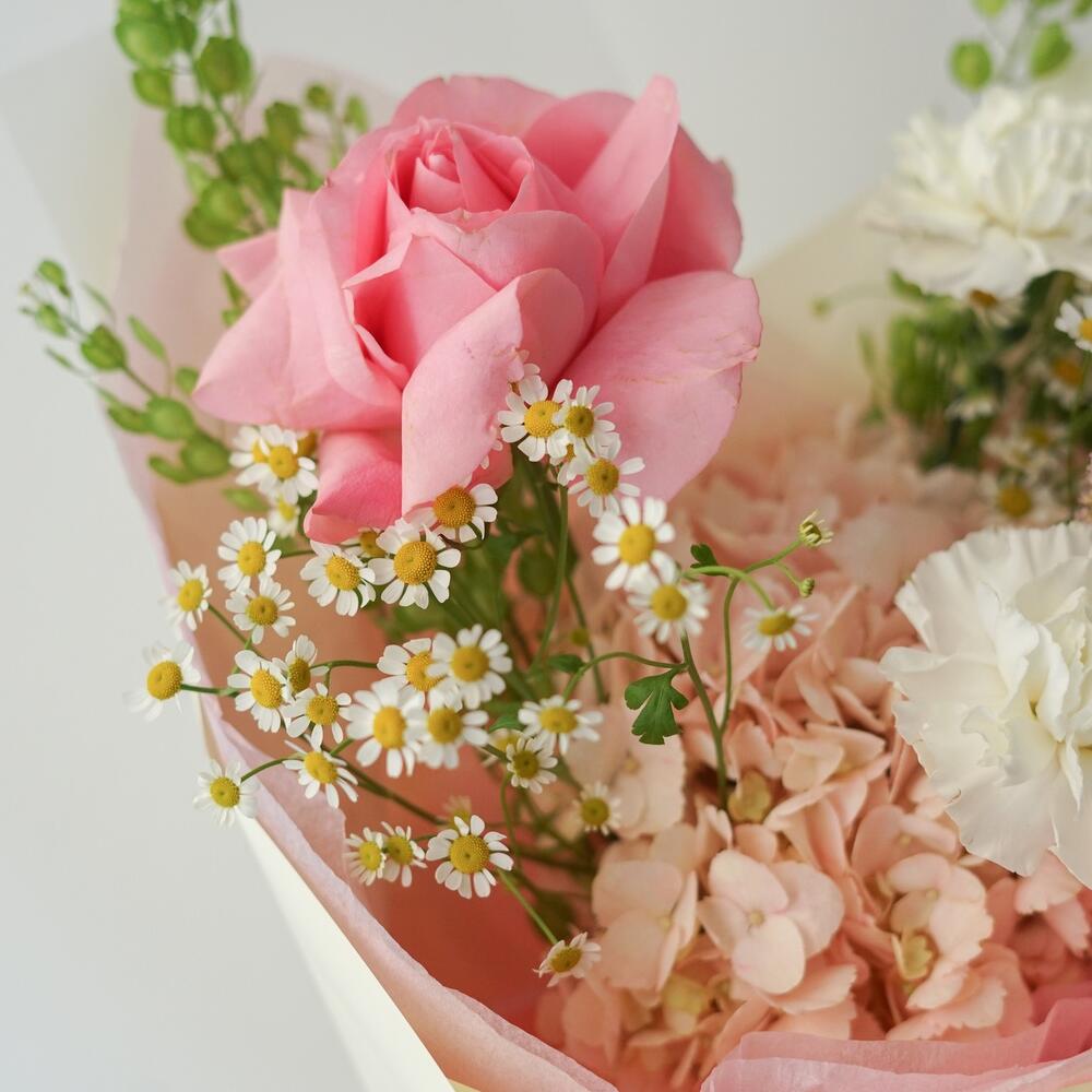 Гортензия – 1 шт.Матрикария – 2 шт.Астильба – 1 шт.Диантус – 2 шт.Гринбелл – 4 шт.Роза французская – 1 шт.Упаковка дизайнерская – 1 шт.