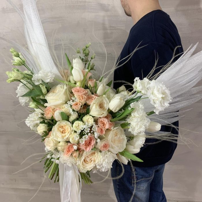 роза пионовидная «вайт о’хара» – 7 шт.роза кустовая пионовидная «miss bombastic» – 10 шт.Роза кустовая – 10 шт.эустома махровая – 10 шт.аллиум неаполитанум – 7 шт.тюльпан премиум белый – 20 шт.Ковыль – 20 шт.Питтоспорум – 5 шт.Писташ – 5 шт.декор ручной работы «крылья» – 1 шт.