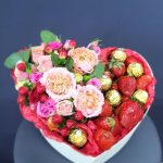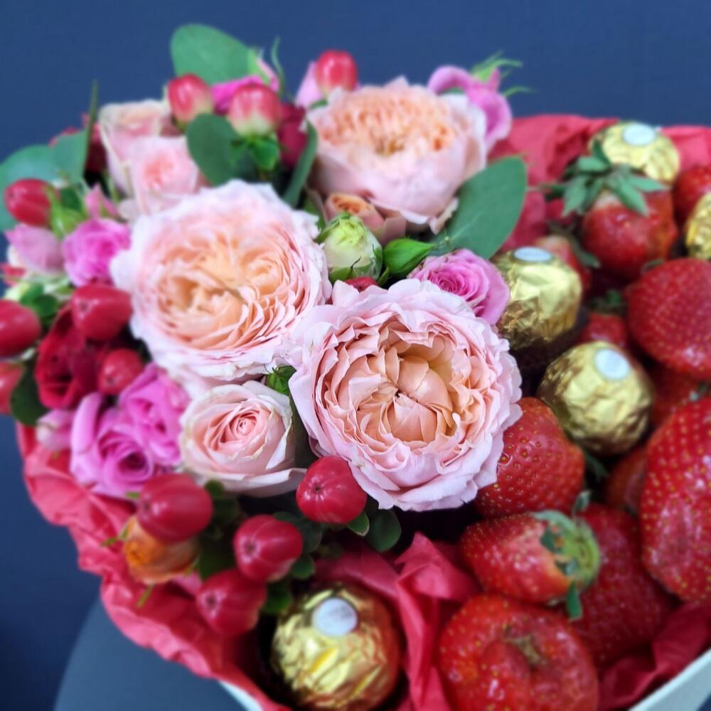 Гиперикум – 2 шт.Клубника – 200 гр.Роза кустовая – 2 шт.Эвкалипт – 1 шт.Роза пионовидная кустовая – 1 шт.