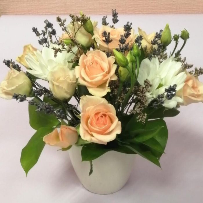 Роза кустовая – 2 шт.Фисташка – 1 шт.Лаванда (сухоцвет) – 10 шт.Лимониум – 1 шт.Оазис флористический – 1 шт.Кашпо керамическое – 1 шт.Хризантема кустовая – 1 шт.