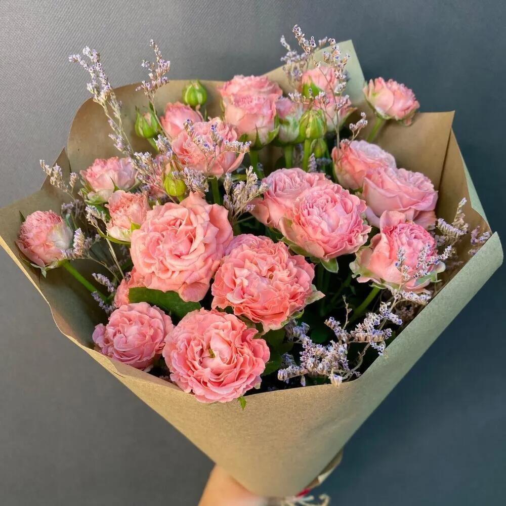 Роза кустовая пионовидная – 5 шт.Лимониум – 3 шт.Упаковка крафт – 1 шт.Джут – 1 шт.