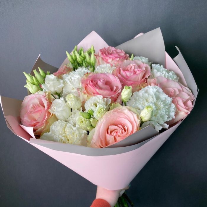 Роза Эквадор – 7 шт.Лизиантус – 4 шт.Диантус сортовой – 5 шт.Упаковка дизайнерская – 3 шт.Лента атласная – 1 шт.
