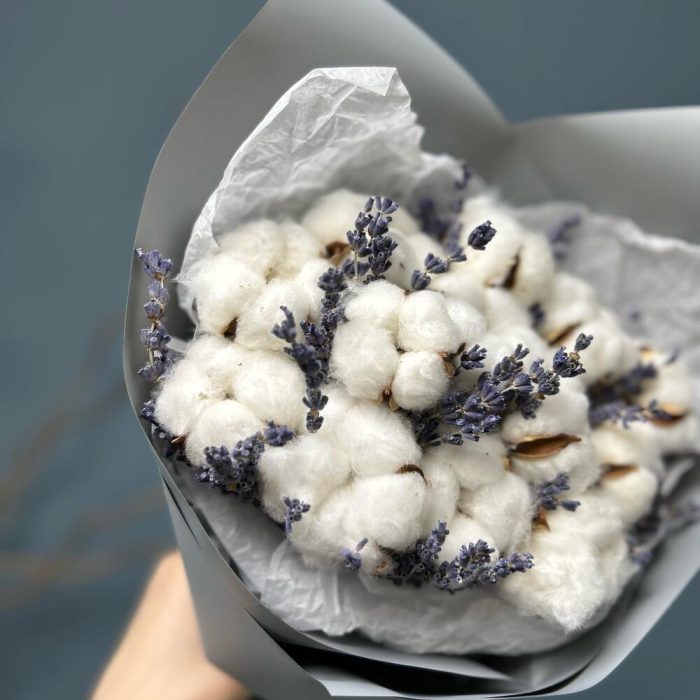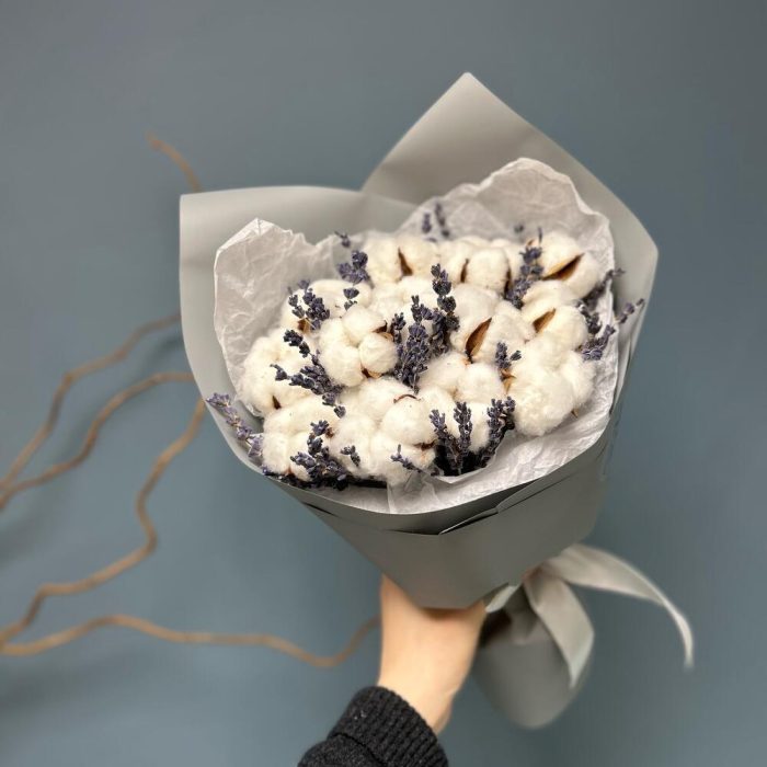 «Лавандовое созвездие» Букет из розы, гвоздики, статица и хлопка