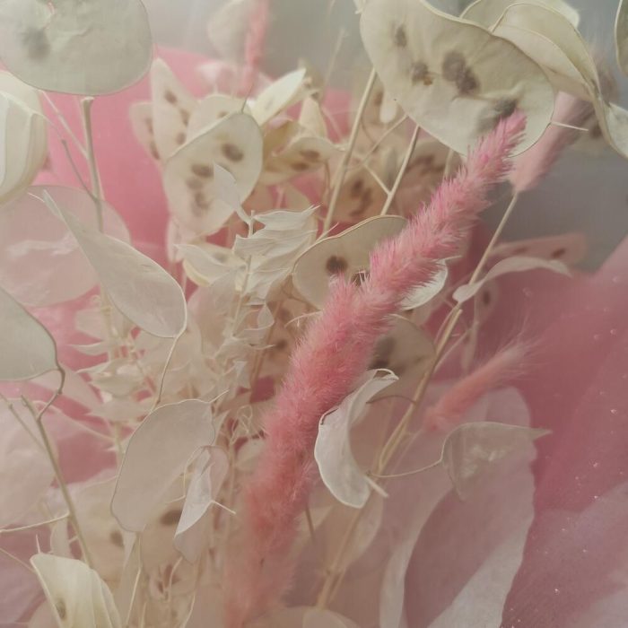 лунария стабилизированная банч – 1 шт.Лагурус (сухоцвет) – 6 шт.камыш декоративный – 2 шт.Тишью – 2 шт.сетка мерцающая – 1 шт.Упаковка дизайнерская – 2 шт.