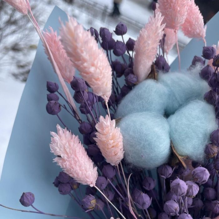 Хлопок натуральный – 1 шт.лëн сухоцвет – 25 шт.Фаларис – 12 шт.Упаковка дизайнерская – 3 шт.Лента атласная – 1 шт.