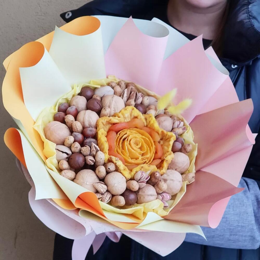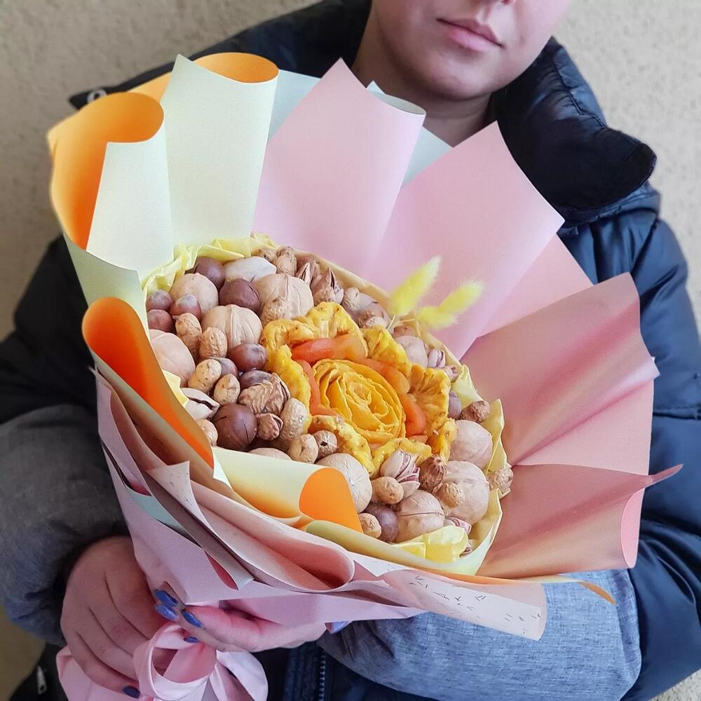 манго вяленое – 95 гр.Курага – 60 гр.ананас вяленый – 75 гр.Орех грецкий – 150 гр.Орех пекан – 30 гр.миндаль в скорлупе – 30 гр.макадамия – 30 гр.фундук в скорлупе – 25 гр.арахис в скорлупе – 50 гр.Фисташки – 12 гр.Лагурус (сухоцвет) – 2 шт.