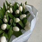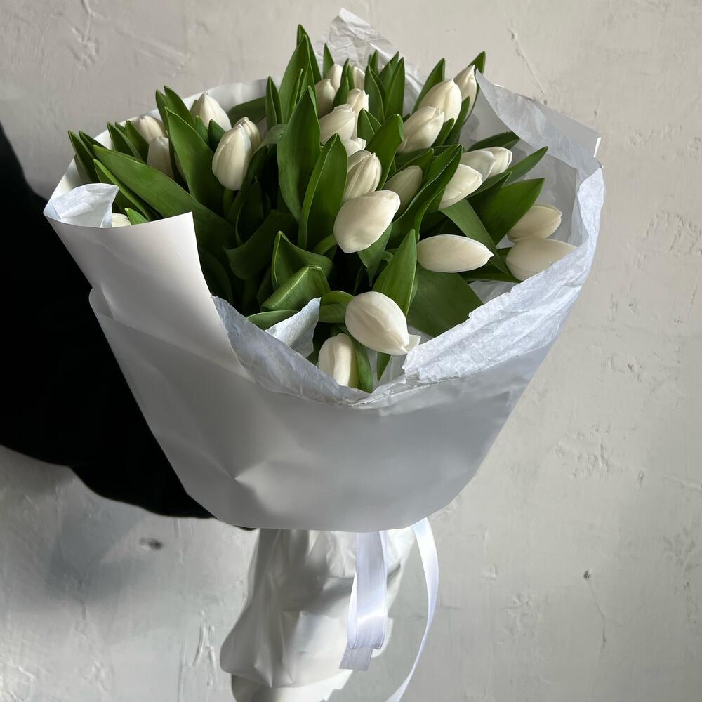 Лента атласная – 3 шт.Упаковка дизайнерская – 5 шт.Белый тюльпан – 29 шт.