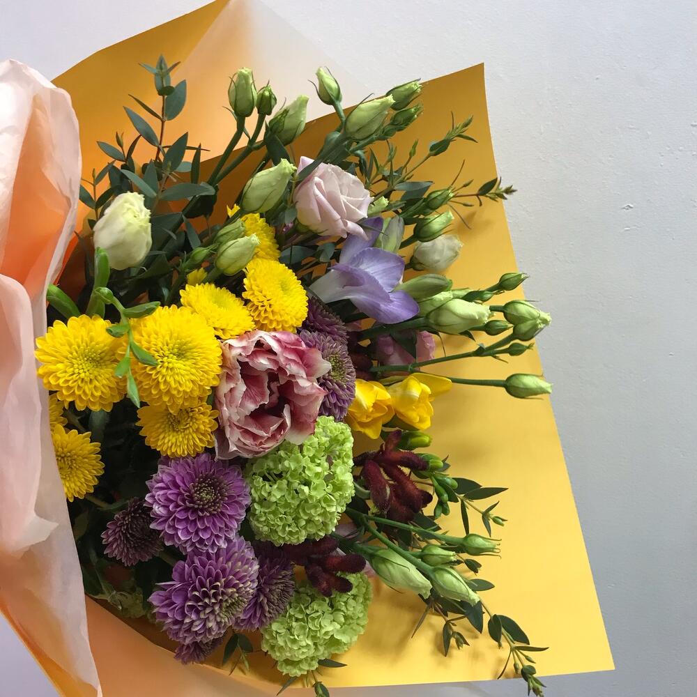 Тюльпан пионовидный – 1 шт.Вибурнум – 1 шт.Сантини – 4 шт.Анигозантус – 1 шт.Фрезия – 2 шт.Лизиантус – 1 шт.Эвкалипт – 1 шт.Упаковка дизайнерская – 1 шт.Лента атласная – 1 шт.Открыточка с вашими пожеланиями – 1 шт.